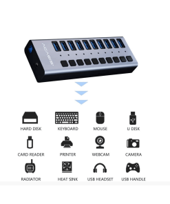 מפצל USB 10 יציאות HS-710MG מחברת ACASIS תומך במהירות עד 450MB/s כולל הגנת מתח מגיע עם ספק כח, למוצר 12 חודשי אחריות
