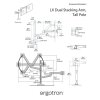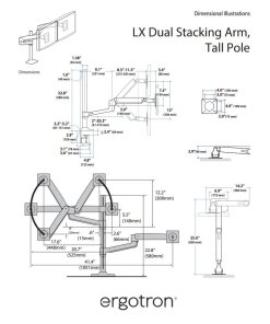 זרוע ארגונומית כפולה Ergotron 45-549-026 יכולה להחזיק בחיבור לשולחן 2 מסכים בגודל של עד 40 אינץ’ (בחיבור אופקי – זה לצד זה) כל מסך ובמשקל מ-7 עד 22 פאונד (3.2-10 ק”ג). זרוע ארגונומית זו בעלת גמישות מרבית עם טווח הזזה של 25 אינץ’ (65 ס”מ קדימה אחורה) אופקית, ניתן לכוונן אותה גם ב-13 אינץ’ (33 ס”מ מעלה ומטה) אנכית ולקפל אותה כדי לפנות את שולחן העבודה כאשר המסך אינו בשימוש. זרוע זו מאפשרת התקנת 2 מסכים על שולחן העבודה ולפנותו לעבודה שאינה ממוחשבת. (למרות שהסרטון בתמונות הממוזערות מציג הנחיות להתקנת זרוע הרכבה לשולחן, שימו לב שהפונקציונליות והמפרטים של זרוע ההרכבה לשולחן LX ו זרוע ההרכבה על הקיר של LX זהה, למרות שמיקום ההרכבה שונה.)