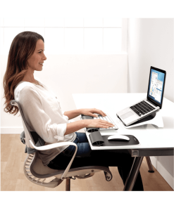 מעמד הגבהה שולחני למחשב נייד בעיצוב גלי למניעת התחממות של המחשב הנייד, המעמד מגביה את המחשב הנייד לגובה העיניים ומקל על הלחץ בכתפיים והצוואר, מעמד הגבהה עם קצה קדמי מונע החלקה של המחשב הנייד, מעמד הגבהה Fellowes | DER9381202 הארגונומי מאושר ומוסמך על פי BS EN ISO 9241 על ידי FIRA international, מסמיך ארגונומי עצמאי.