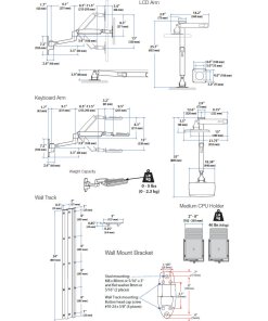 - * קיבולת משקל: מסך = 7–25 פאונד (3.2–11.3 ק”ג); מקלדת = 5 פאונד (2.2 ק”ג); מחשב = 40 פאונד (18 ק”ג). עם צגים במשקל של יותר מ-20 פאונד (9.1 ק”ג), טווח התנועה האנכי עשוי להיות מופחת עד 4.5 אינץ’ (11 ס”מ) עבור טווח גובה כולל של 8.5 אינץ’ (22 ס”מ)
