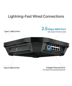 - חיבור אולטרה – 1 × 2.5 Gbps WAN port, 8 × Gigabit LAN ports, and 2 × USB 3.0 in Type A and Type C