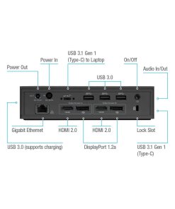 תחנת העגינה נועדה לתמוך בכל מותגי המחשבים הניידים במגוון רחב של תאימות של ציוד היקפי והתקנים. עם ארבע יציאות USB-A 3.0 (כולל אחת שמספקת טעינה גבוהה)