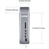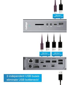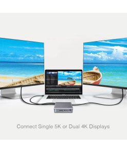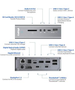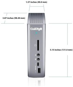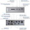- [15 יציאות לחיבור התקנים]: x2 Thunderbolt 3 40Gb/s, חיבור לצג 1.2, 5x USB-A ו-1 USB-C 3.1 דור 1 (5Gb/s) x1 USB-C 3.1 דור 2 (10Gb/s נתונים בלבד), Gigabit Ethernet, חריץ כרטיס UHS-II SD (SD 4.0), אודיו אופטי (S/PDIF), אודיו סטריאו 3.5 מ”מ כניסה ויציאה. מנח אנכי או אופקי. מבנה אלומיניום עם גוף קירור משולב ללא מאוורר.